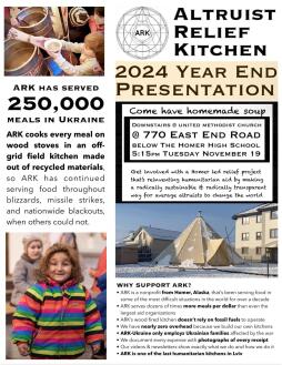 Come have delicious hot soup and hear about ARK, a Homer-led relief project that is reinventing humanitarian aid by making a radically sustainable and radically transparent way for average altruists to change the world. Find out what we're doing now, what we have planned for the future, and how to get involved.