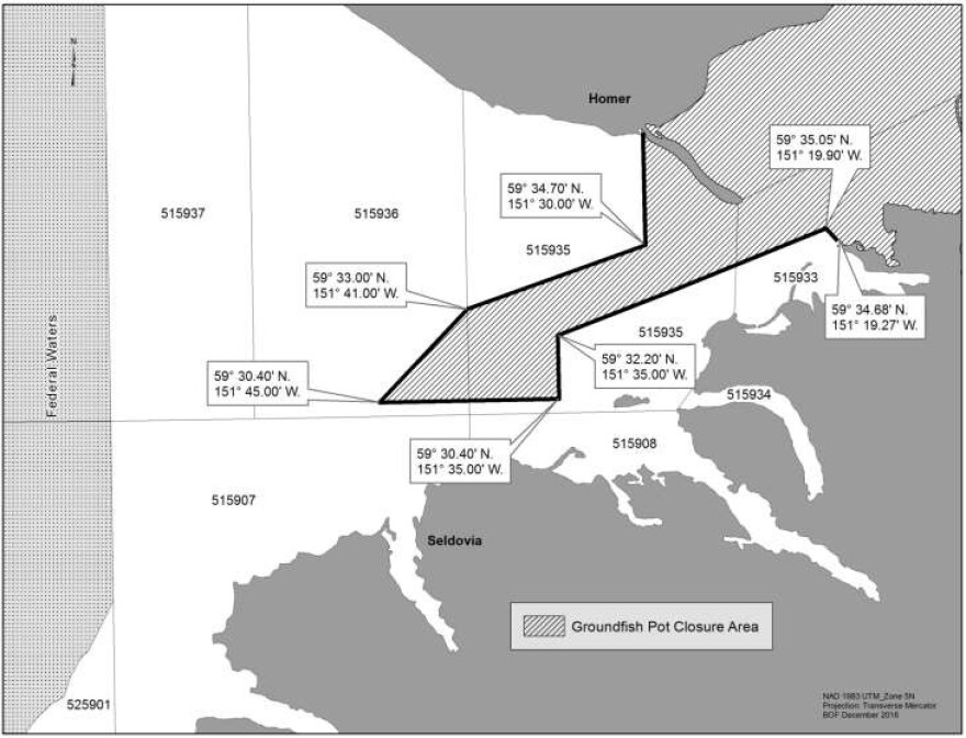 At the Lower Cook Inlet Board of Fisheries meeting in Homer, the Board amended and adopted a proposal to change the groundfish pot closure area boundaries in the Cook Inlet Management Area.