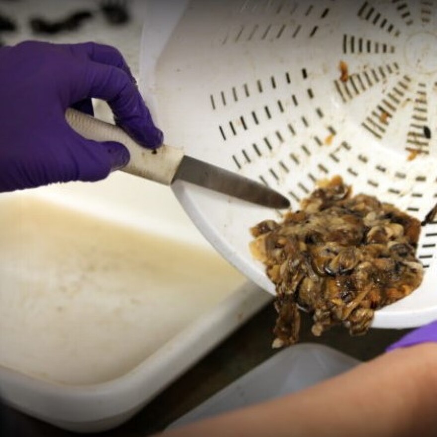 Jen Hamblen has purple plastic gloves on and a long black apron. She’s shucking blue mussels, the kind you might find in a seafood restaurant.