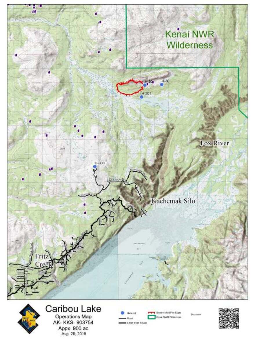 The Caribou Lake Fire, 25 miles northeast of Homer, is 20 percent contained and is estimated to cover 900 acres. Around 80 people are fighting the fire.